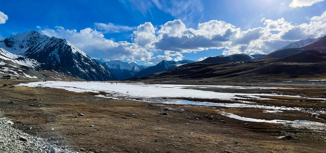 The day begins with a steady ascent from Leh into a whitewashed Himalayan world, gradually climbing toward Khardung La, one of the highest motorable passes, where a short halt offers sweeping views of snow-clad peaks and icy windswept terrain. From here, the journey eases into the quieter landscapes of Nubra Valley, where the descent reveals broader valleys, rivers edged with frost, and ancient Diskit monasteries resting peacefully against the mountains. As you continue deeper into the valley, winter-kissed dunes and the unique scenery around Hunder create an almost surreal contrast between desert textures and snow. The day settles beautifully as the evening light paints the Hunder Dunes in soft pastel hues, offering a serene winter finish before resting in the valley.
